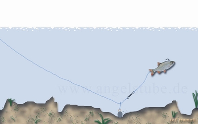 Diese Montage ist für das Standart Grundangeln.Tip: kleines Holzstück in das Fischmaul schieben damit ein kleiner Auftrieb entsteht oder einfach die Rückenflosse abschneiden. |